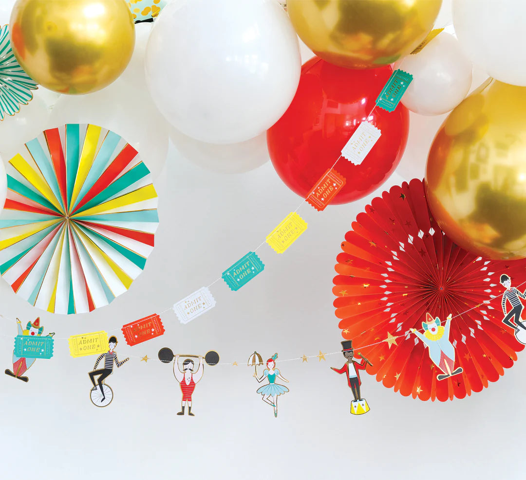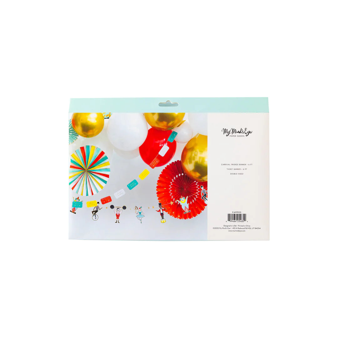 Step right up to the party with this whimsical carnival inspired banner set. Featuring a banner full of a cast of carnival characters that are a stand out with their gold foil accents. Also included in this banner set is a ticket banner that insures that you are admitted to all the fun!
