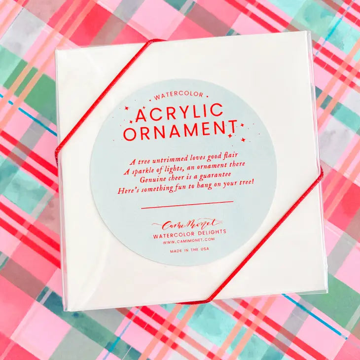 This watercolor gingerbread house Christmas ornament is such a cute addition to your holiday decor. Made of acrylic and designed in watercolor painted by Cami Monet, the Pink Peppermint Chalet will be treasured for years to come. Collect the entire set of watercolor gingerbread houses, as well as the matching stir sticks! A tree untrimmed loves good flair A spark of lights, an ornament thre Genuine cheer is a guarantee Here’s something fun to hang on your tree! DETAILS • Approximately 3” acrylic ornament • Packaged to perfection in a gift box with bow (these make great stocking stuffers!) • Includes red ribbon • Made in the USA • Original watercolor illustration by Cami Monet